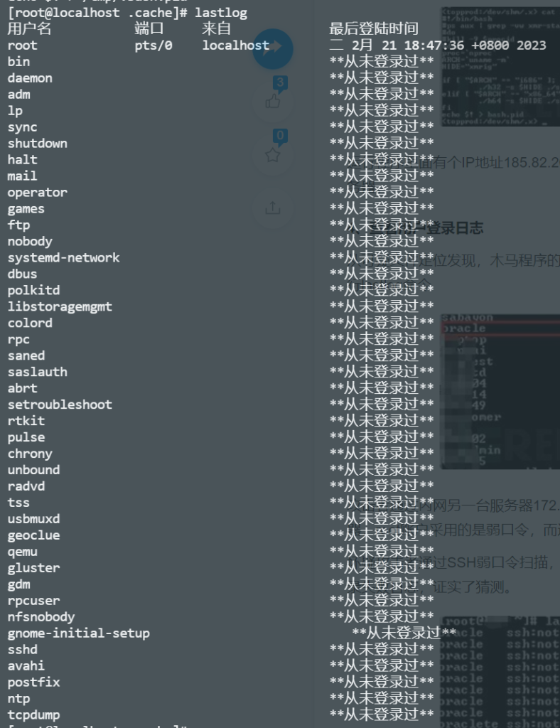 使用命令查下登录日志,感觉不妙,感觉自己的root被破了。