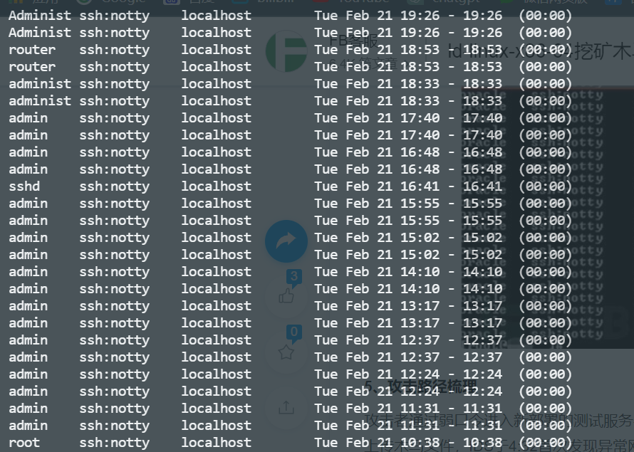 而且里面有几个用户明显不对,虽然没有被登录过,但是明显感觉不对。用lastb看看登录历史,明显别人有攻击行为。