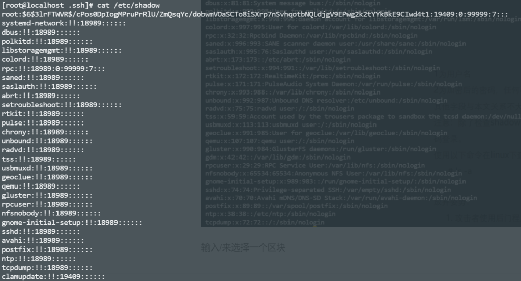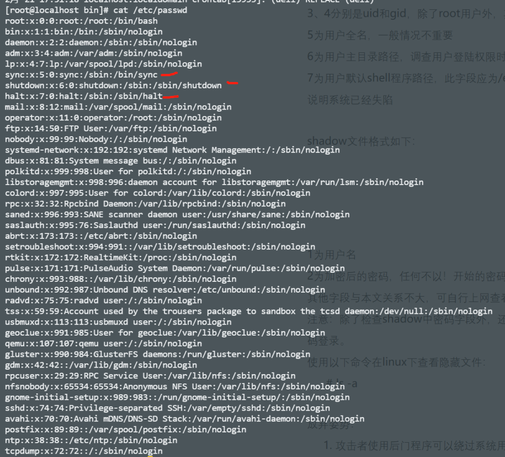顺便看下/etc/shadow文件,密码不易!开头的都有问题,统统删掉用户,使用userdel <用户名>删掉