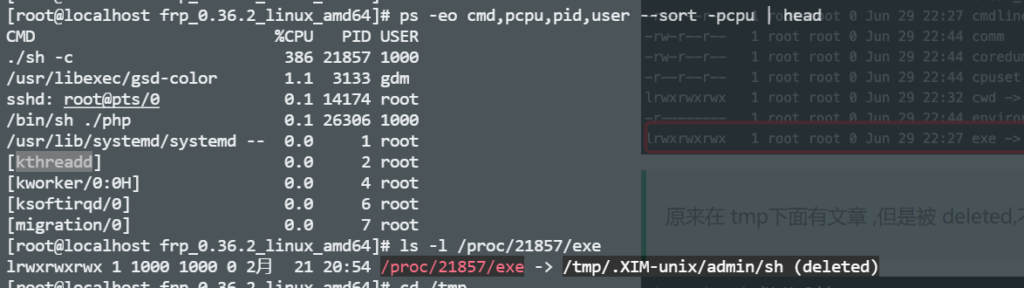 做到这里感觉差不多了,搜下最高的进程占用,然后kill -9 pid删除掉,但是,有意思的来了,kill掉立马又启动,非常倔强的进程,根本停不掉,而且跟神奇的是,找到其启动程序后,启动文件竟然已经被删除掉了,那就看看它的守护进程吧,哪个把他起来的。